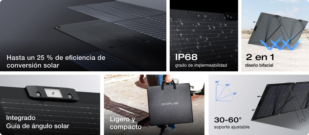 Con un lado principal de 160 W y un lado de 125 W en la parte posterior para la luz ambiental, puede capturar hasta un 28 % más de energía solar y cargar su estación de energía portátil aún más rápido.
