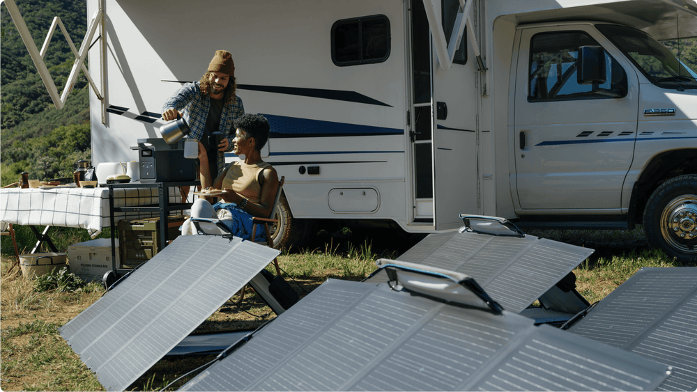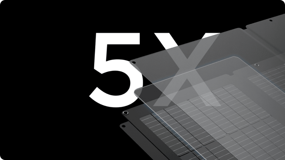 Con un lado primario de 220 W y otro de 155 W situado atrás para la luz ambiente, se puede captar hasta un 25 % más de energía solar y cargar la estación de energía portátil incluso más rápido. Una tasa de conversión de hasta el 23 % garantiza unas velocidades altas de carga solar: 0-100 % en 3.9 horas (3 conjuntos) y 5.8 horas (2 conjuntos).
