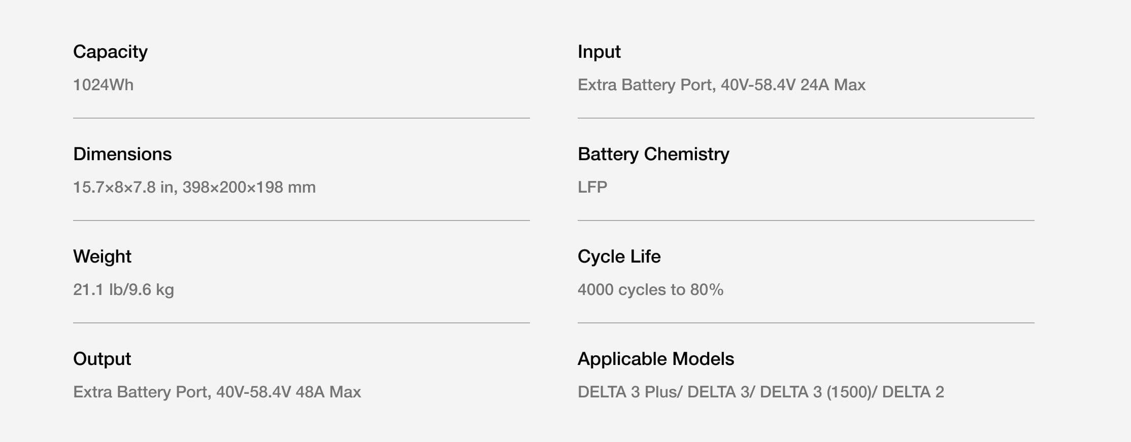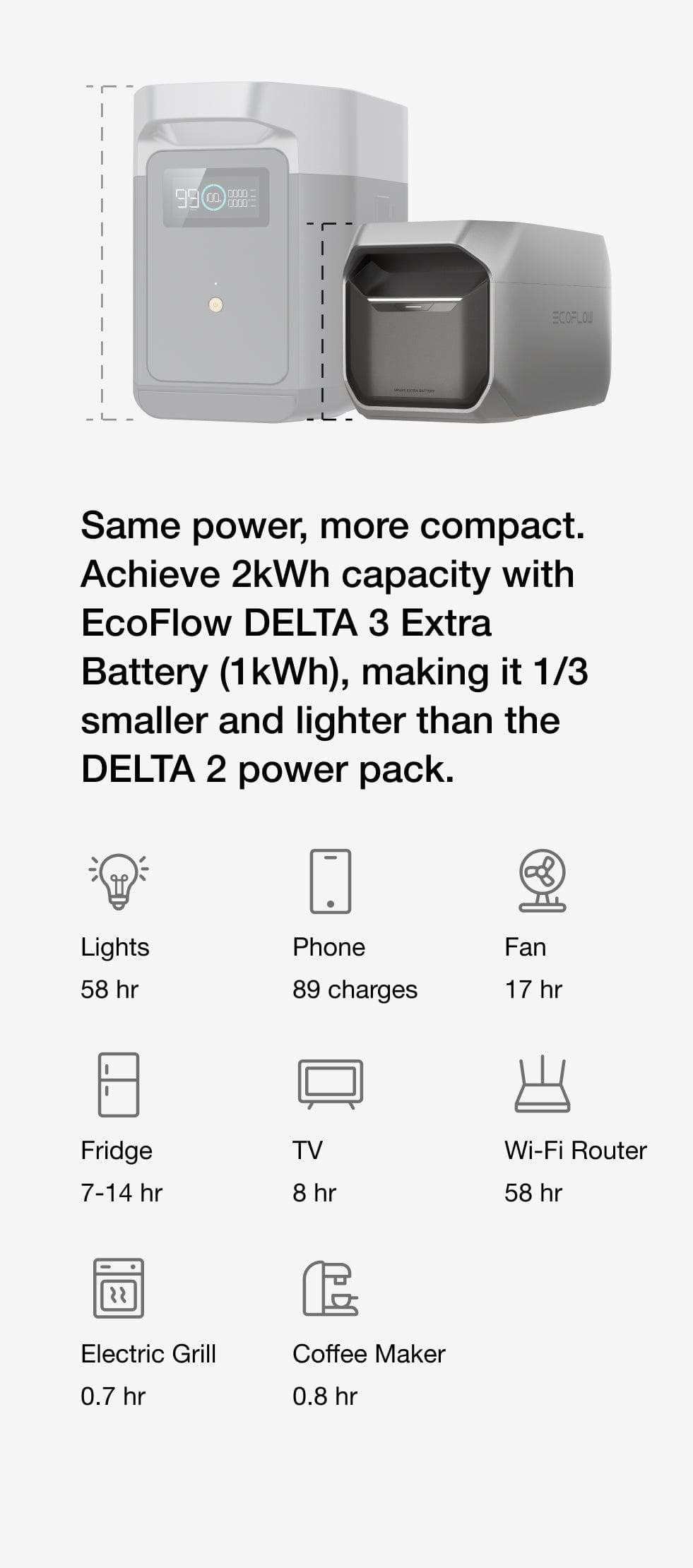 Aumenta la capacidad de DELTA 3 Plus/DELTA 3 con 1024 Wh adicionales. Duplica la capacidad para adaptarse a sus necesidades de almacenamiento de energía, ideal para copias de seguridad en el hogar, caravanas al aire libre y el uso diario.
