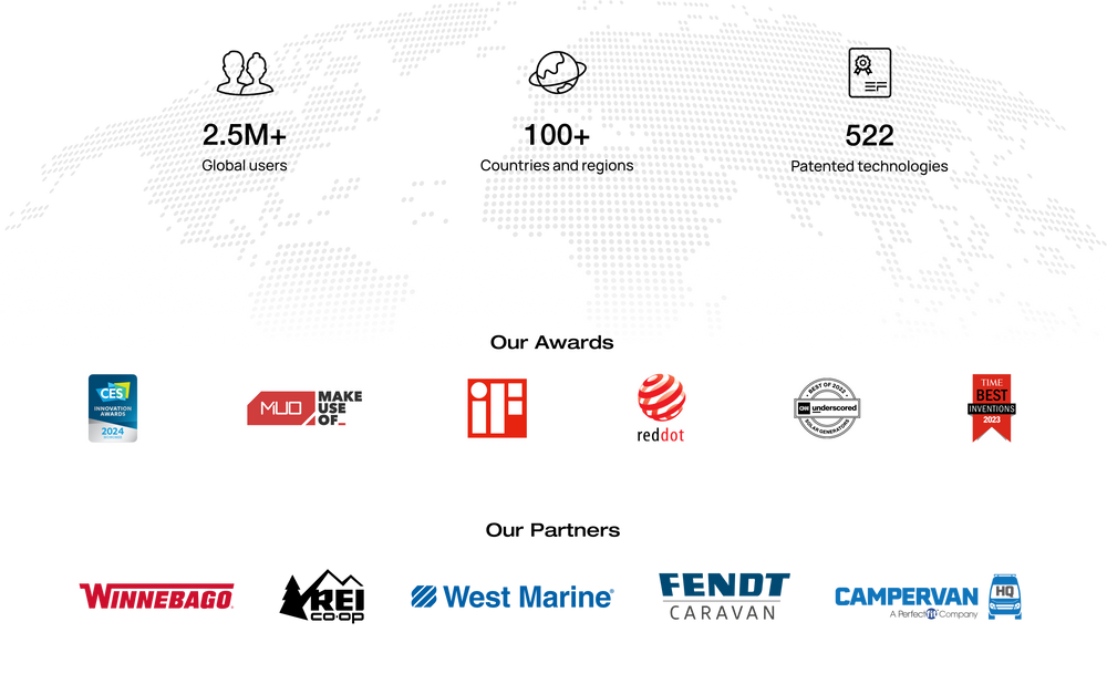 EcoFlow ofrece sus productos en más de 100 países y regiones, con una base de 3 millones de usuarios en todo el mundo. Nuestros productos están a la vanguardia de la tecnología de la industria y cuenta con la certificación y el reconocimiento de medios y premios del sector tecnológico. Estamos autorizados como socios estratégicos oficiales con las compañías más importantes de la industria de las casas rodantes y de las actividades al aire libre.