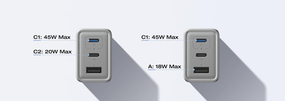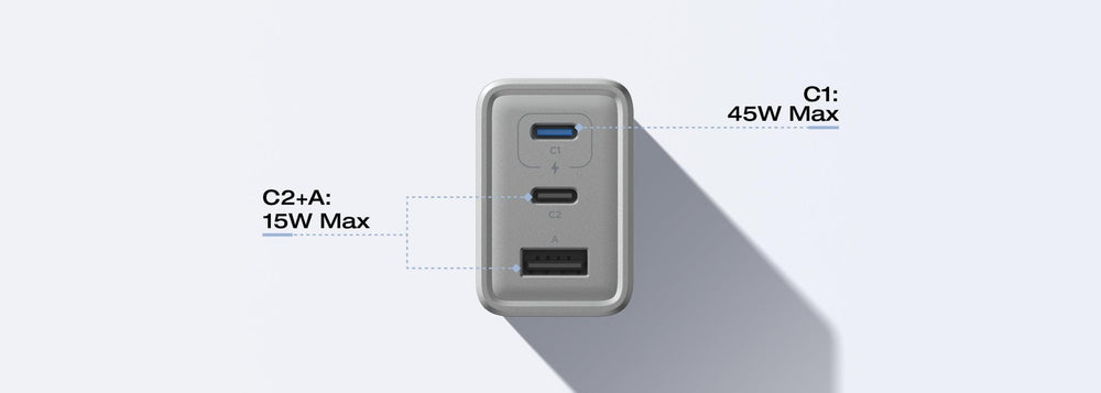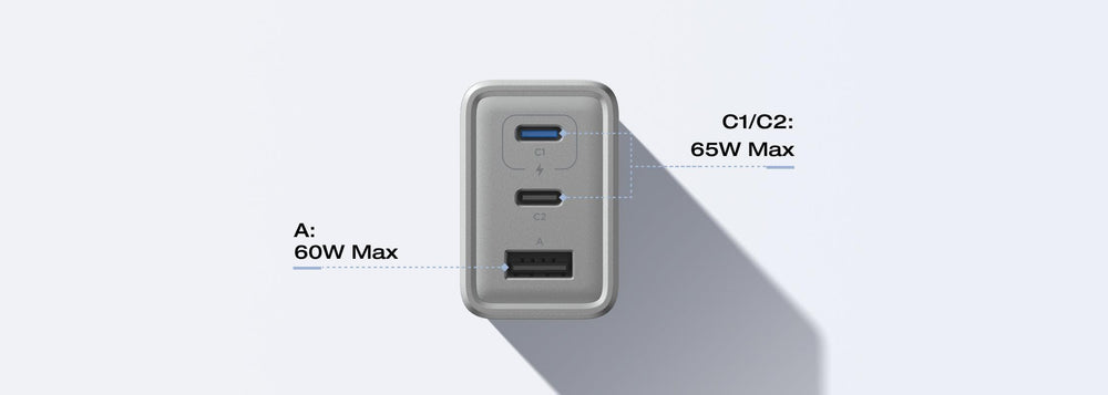 Potencia de 1 solo puerto: USB-C1 y C2 hasta 65 W; USB-A hasta 60 W Potencia de 2 puertos: USB-C1+C2: C1 hasta 45 W; C2 hasta 20 W USB-C1+USB-A: C1 hasta 45 W; A hasta 18 W USB-C2+USB-A: 15 W combinados USB-C2+USB-A: 15 W combinados Potencia de 3 puertos: USB-C1 hasta 45 W; C2+A 15 W combinados