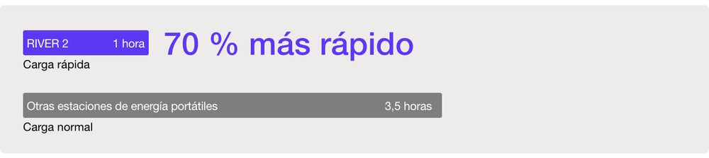 RIVER 2 supera la velocidad promedio de carga en la industria, realizando una carga completa en tan solo 60 minutos*¹. Es decir, un 70 % más rápido que otras estaciones de energía portátiles del mercado y un 38 % más rápido que las generaciones anteriores. Carga completamente tu RIVER 2 mientras empacas, así estarás siempre listo para cualquier viaje de última hora.