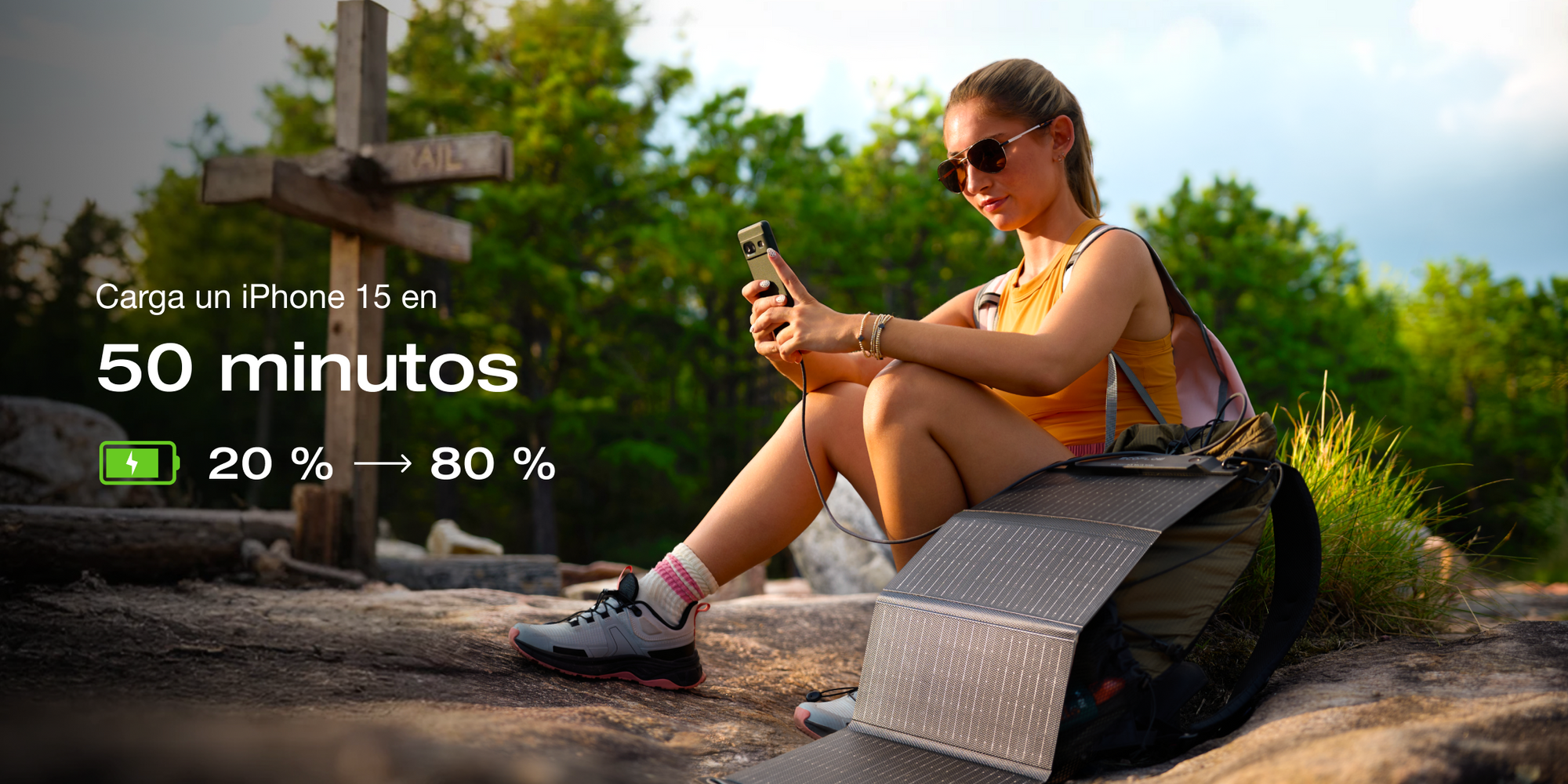 Bajo cielos despejados (34 °C / 93,2 °F, UV ~8), el iPhone 15 se cargó del 20 % al 80 % en 50 minutos. Los resultados pueden variar según el entorno, el uso y el estado de la batería.