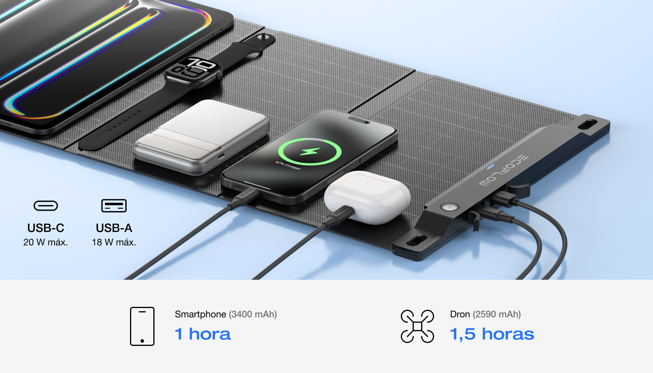 El panel solar puede generar hasta 28 W de potencia de salida, suministrando energía al circuito interno de la caja de conexiones. Sin embargo, la intensidad de la luz y las pérdidas en las líneas de buck/boost pueden hacer que este número sea inconsistente, por lo que los puertos USB-A y Tipo-C tienen especificaciones de carga rápida de 18 W y 20 W para suministrar la salida de energía externa de manera más estable.