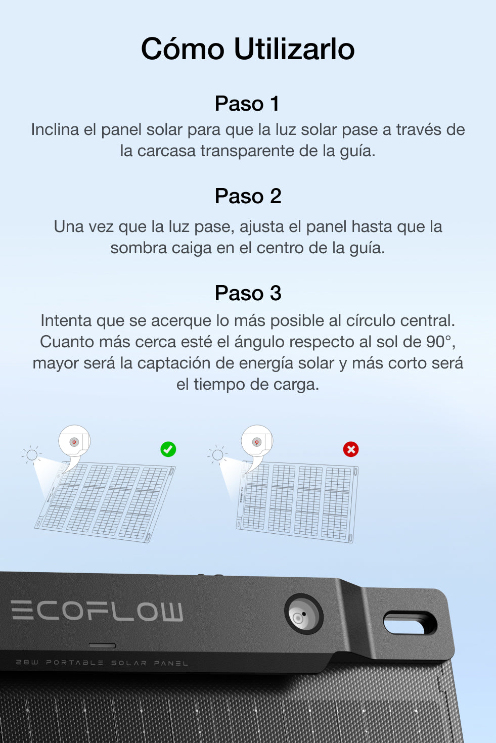 Para un rendimiento máximo de carga solar, ajuste el ángulo y la orientación del panel solar para asegurar una exposición directa a la luz solar.