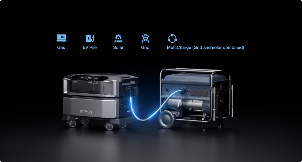 Tiene muchas opciones de carga para elegir con EcoFlow DELTA Pro Ultra. Además de los métodos habituales, como la energía solar o de la red, ahora puede realizar la carga utilizando un generador a gas o hasta una pila de carga de vehículos eléctricos. Con las velocidades de carga más rápidas de la industria, de 8800 W, cargue hasta dos baterías en solo 2 horas.