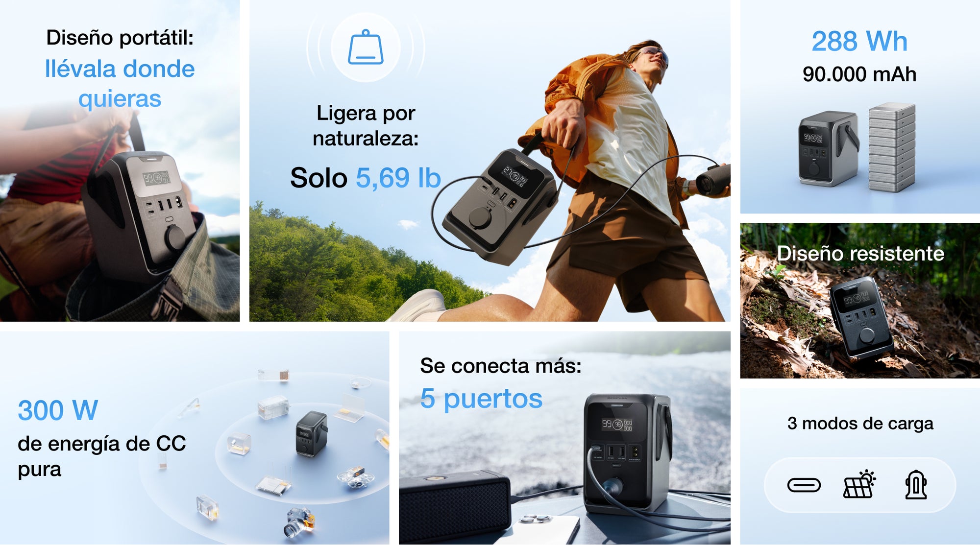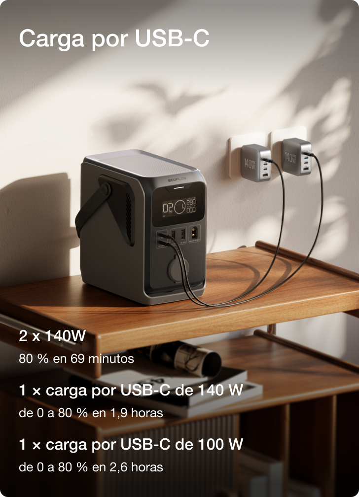 Recarga flexible por USB-C, carga de vehículo o paneles solares, para una energía fiable en cualquier situación al aire libre.