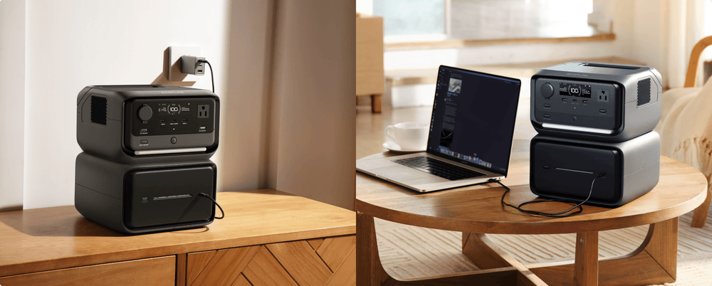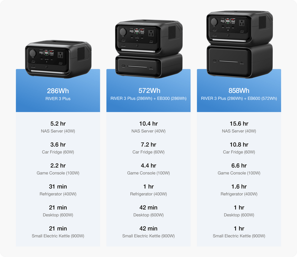 Mejora tu RIVER 3 Plus con una batería adicional. Elige entre el EB300 (286 Wh) o el EB600 (572 Wh) y apílalos de una en una para conseguir hasta 858 Wh de energía pura.